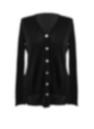 Elegant kofta med knappar av pärlemo i svart färg och v-ringning, tillverkad av merinoull och siden som håller dig lagom varm och fin i alla sammanhang. Lika bra till vardag som till fest. Materialet känns mjukt och behagligt och silket tar bort den stickande känslan som ibland kan förknippas med ullmaterial.