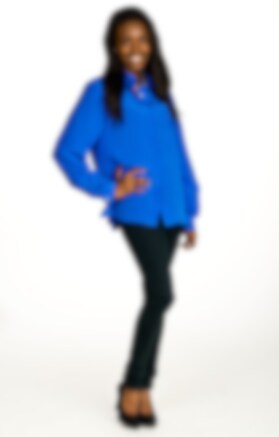 Klassisk damblus i siden med lång ärm och dold knappslå. Ljuvlig känsla i 100% siden. Underbar kornblå nyans som verkligen lyser upp.