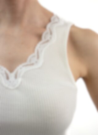 Underbart vitt sidenlinne med vacker mjuk spets i ringningen. Sidenlinne helt utan sidosömmar i 70% siden och 30% bomull med mjuk och följsam ribbstickning. Passar perfekt under alla toppar och tröjor sommar som vinter. Värmande Vårt mjuka ribbstickade siden är oerhört temperaturreglerande & behagligt mot huden. Det ribbade materialet är följsamt och upplevs ibland som lite varmare än vår släta silketrikå. Klassisk vit nyans.