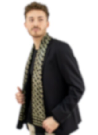 Sidenhalsduk i dubbelsidig högkvalitativ sidensatin av premiumkvalité. Klassiskt mönster på svart botten.