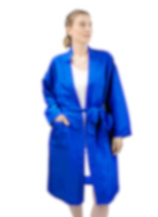 Lyxig sidenmorgonrock i 100% mullbärssilke. Lyxigt, lättskött och lättpackat! Den perfekta morgonrocken att ha både hemma och på resan, smidigt & hållbart silkestyg. Stilig och praktisk sidenmorgonrock med klassiskt snitt, sjalkrage & fickor. Underbar kornblå nyans!