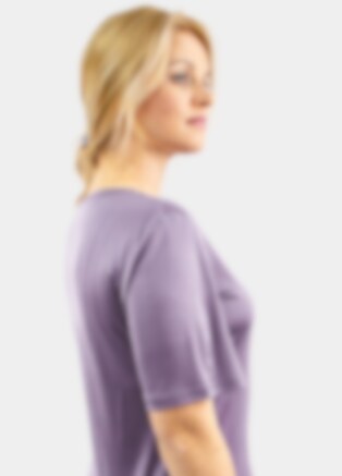 Underbart sidennattlinne i 100% silketrikå. Mjukt, följsamt och bekvämt med rundringad hals. Medellångt nattlinne som sträcker sig över knäna. Färgen skymning ger en grå och lila nyans beroende av ljuset.