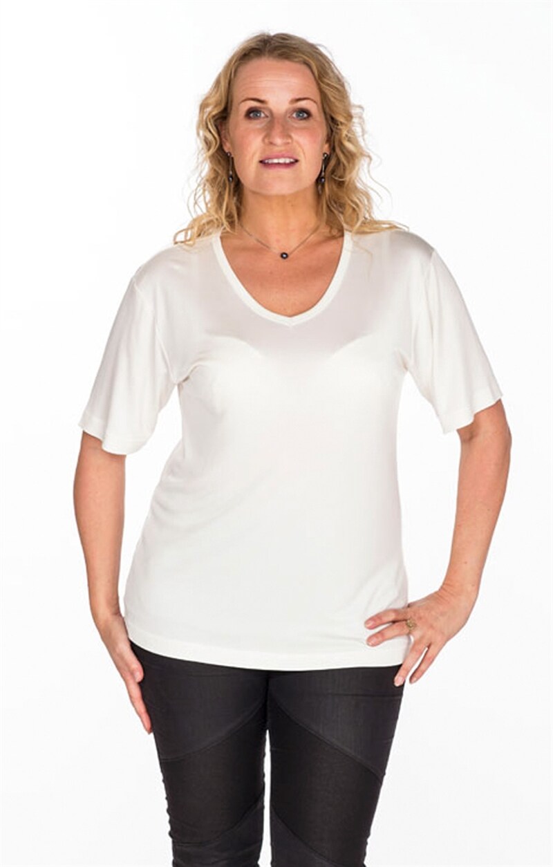 Praktisk t-shirt i kraftig silketrikå med klassisk v-ringning. Bra unisexmodell med rakt snitt.